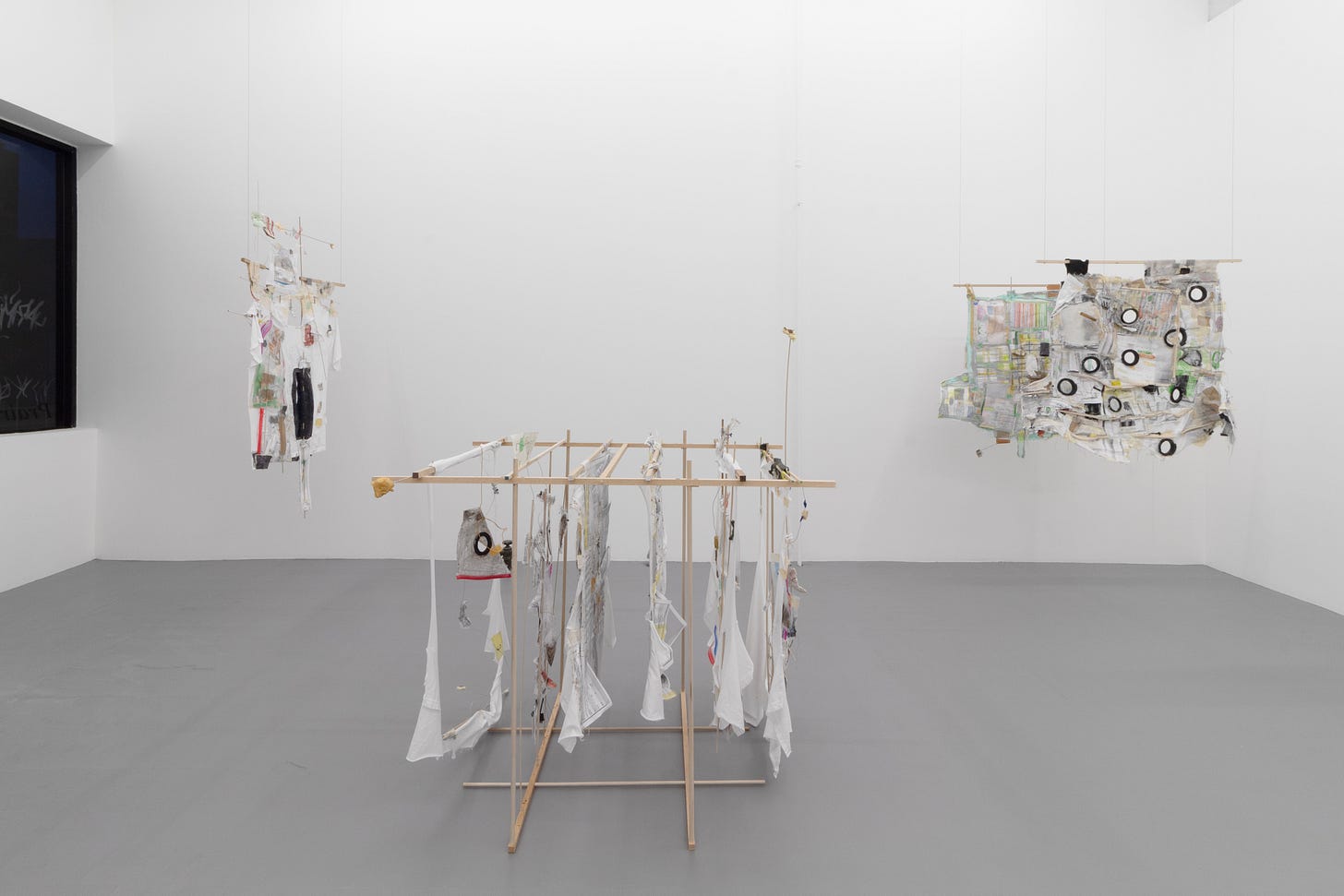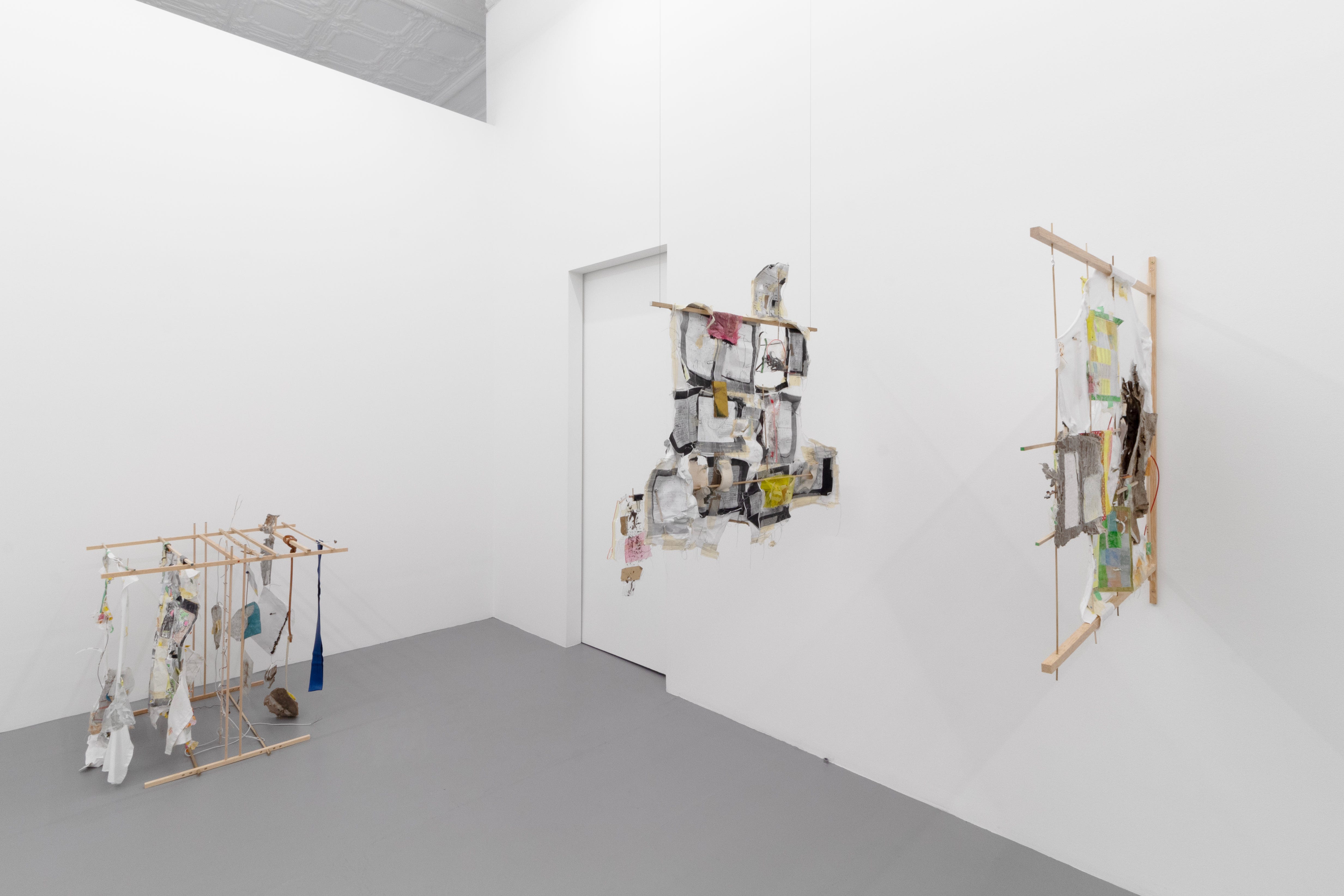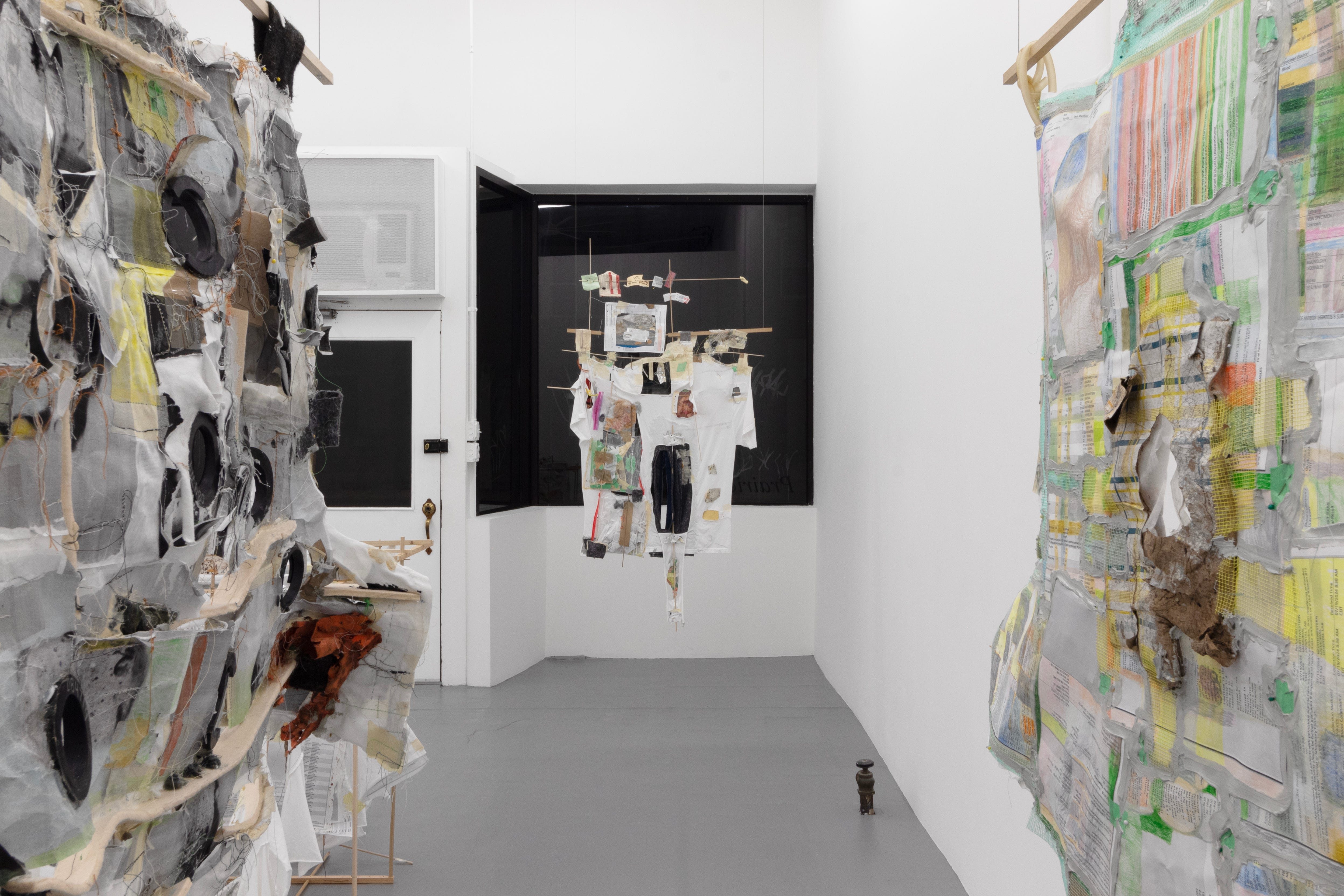 I learned a lot about the work moving from rehearsal installations in my studio to the collaborative process of installing with Jack and Tim at the gallery. Our install prioritized a language of multiplicity while working to establish an order that maintained breathing room for different notes to hit. This ultimately meant editing out some beloved pieces for the good of the group and the room. Decisions for placement were necessarily responsive to the architecture, and I realized that the works were already anticipating this: I used 36” dowels as a standard width, the same measurement for accessible doorways and pathways. Not a huge coincidence, as shirts are also designed for bodies to pass through. In the resulting arrangement, it was impossible to photograph most of these pieces as individual works. Foreshadowed by my text, “I care more about the pharmacy-receipt-ridden-sketchbooks than I do the autonomous painting.”