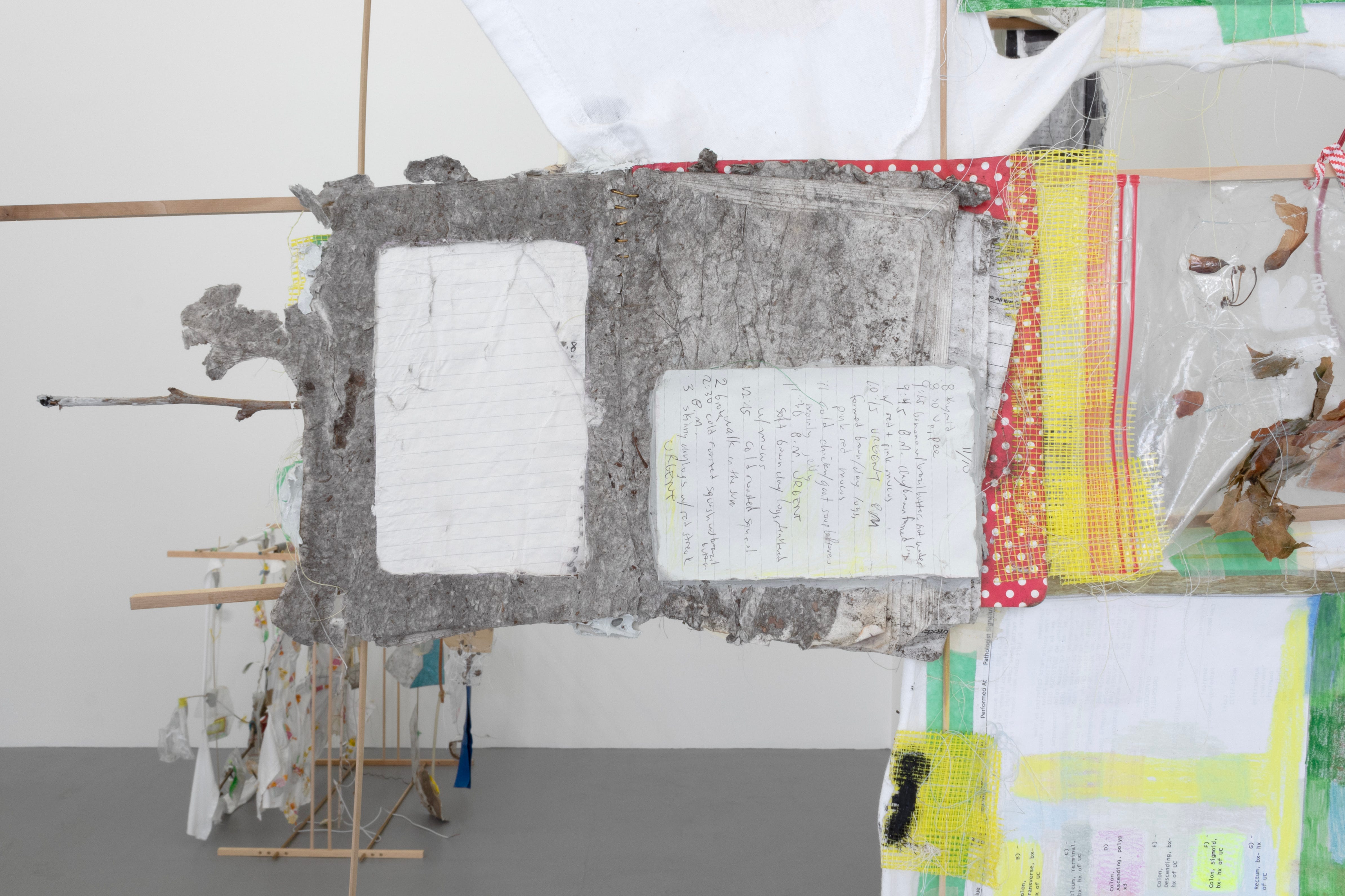 I wrote the show’s accompanying, titular text earlier this spring, and in many ways the writing gave me clarity of purpose in the studio, as the work continued to evolve iteratively. The text privileges the anecdotal over any overt explanation of the formal. In a nod to Chicago’s queer art lineage, I mined my memory of finding Roger Brown’s pharmacy receipts in 2009 to contextualize how I’m approaching found objects in the present. I was excited that people might come to the show already thinking about “pharmacy-receipt-ridden-sketchbooks”, and then encounter a sculptural index of deconstructed t-shirts, documents, and detritus. A kind of physical translation of the text’s proposal, that “everything is a receipt, an artifact, a chronicle, an archive.”