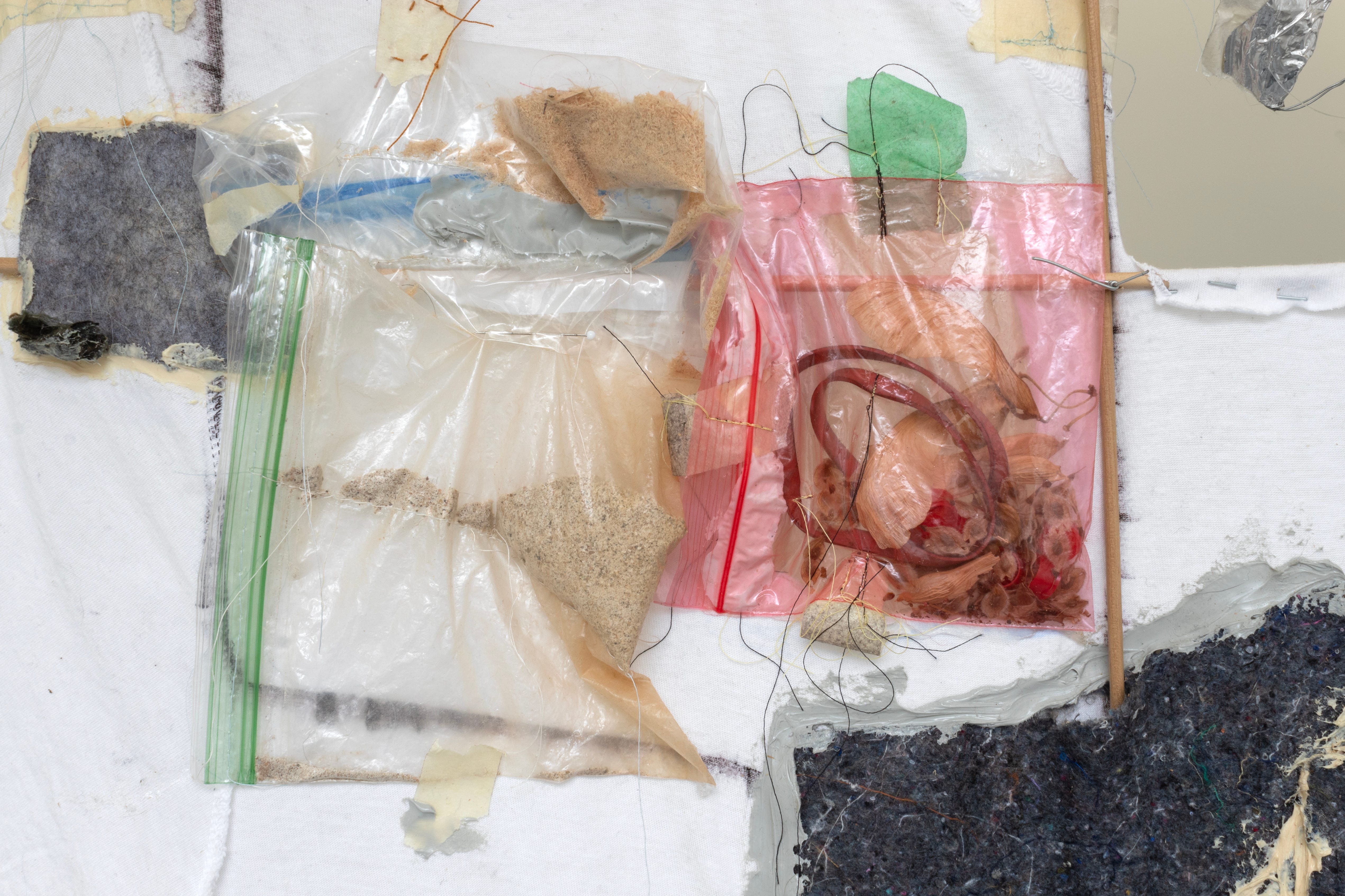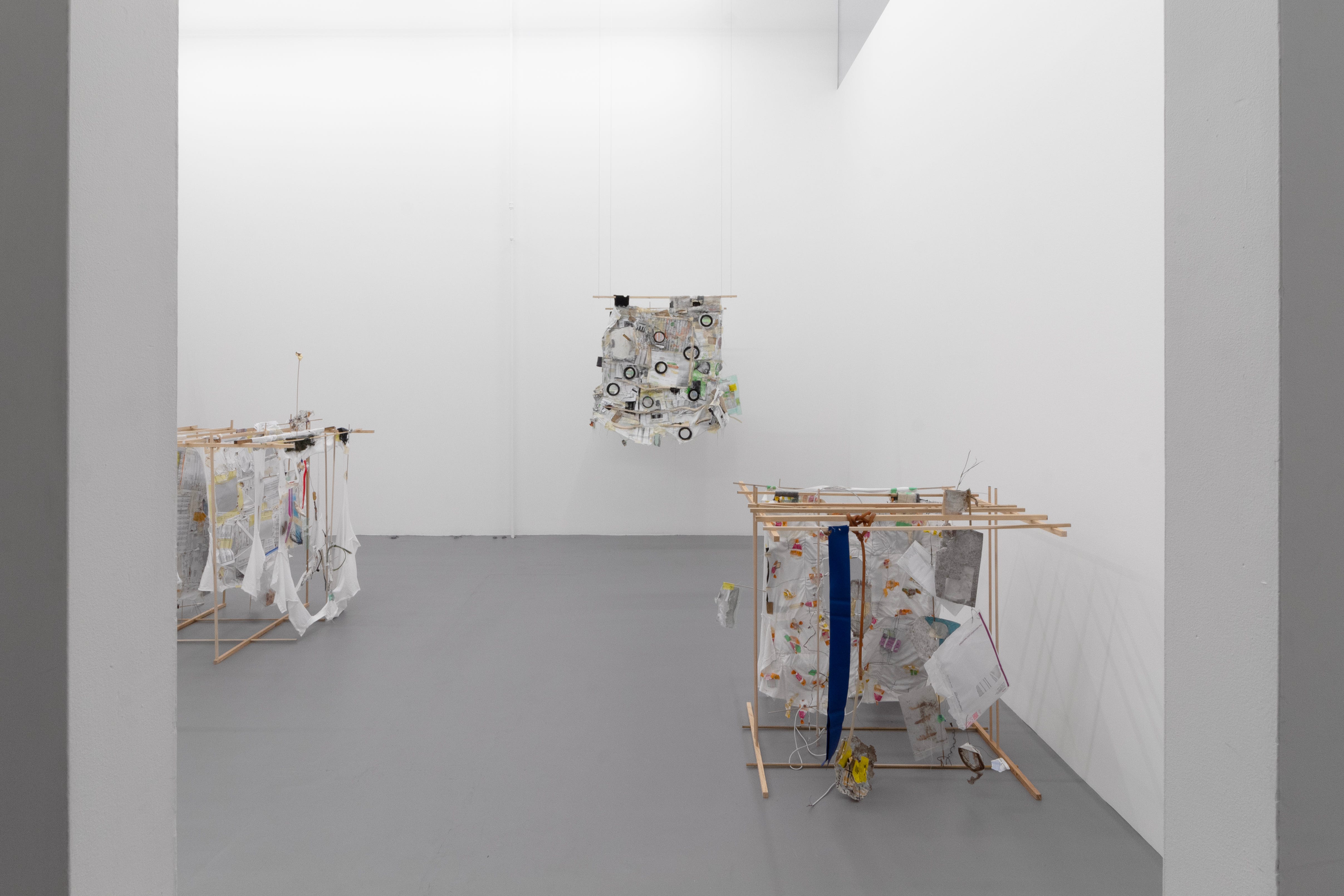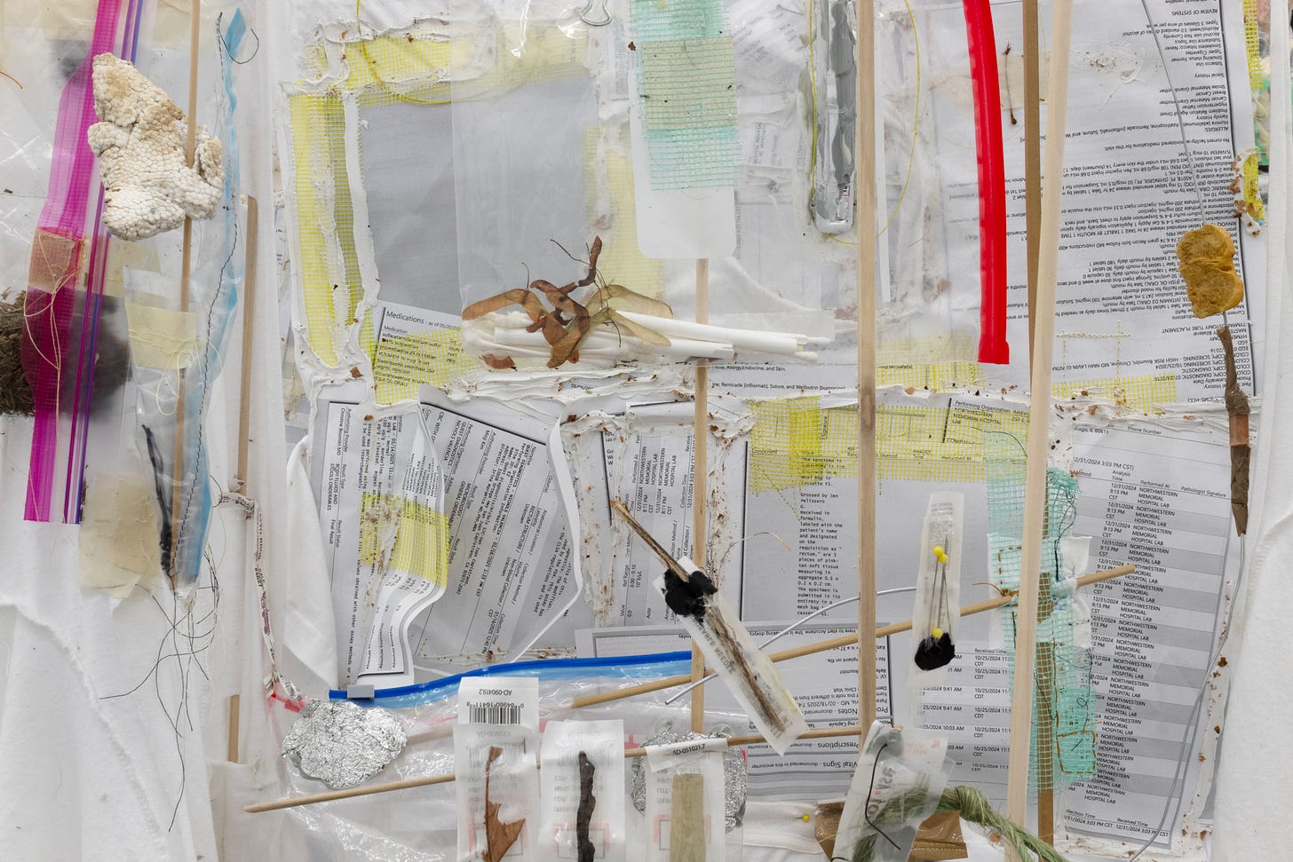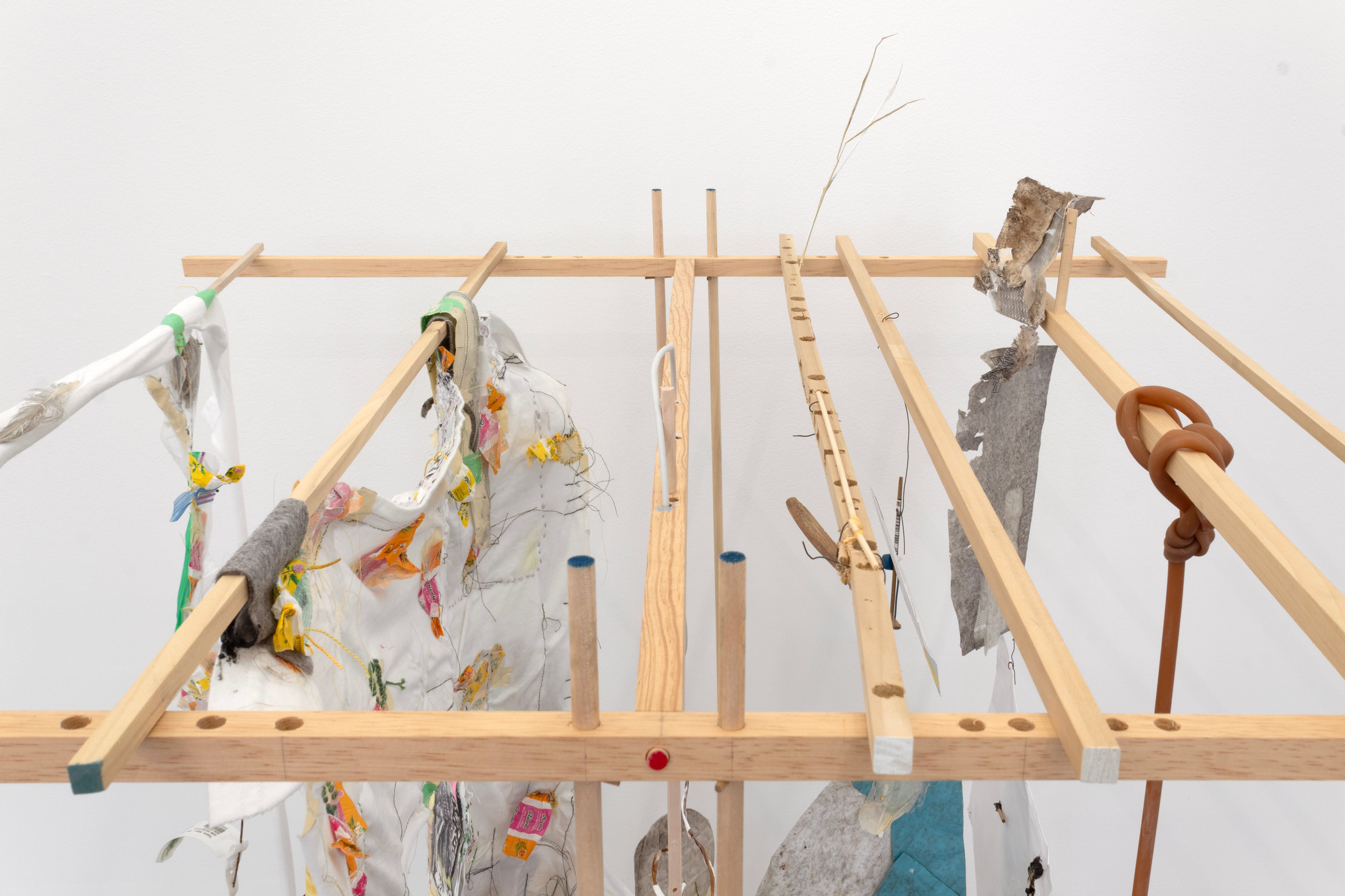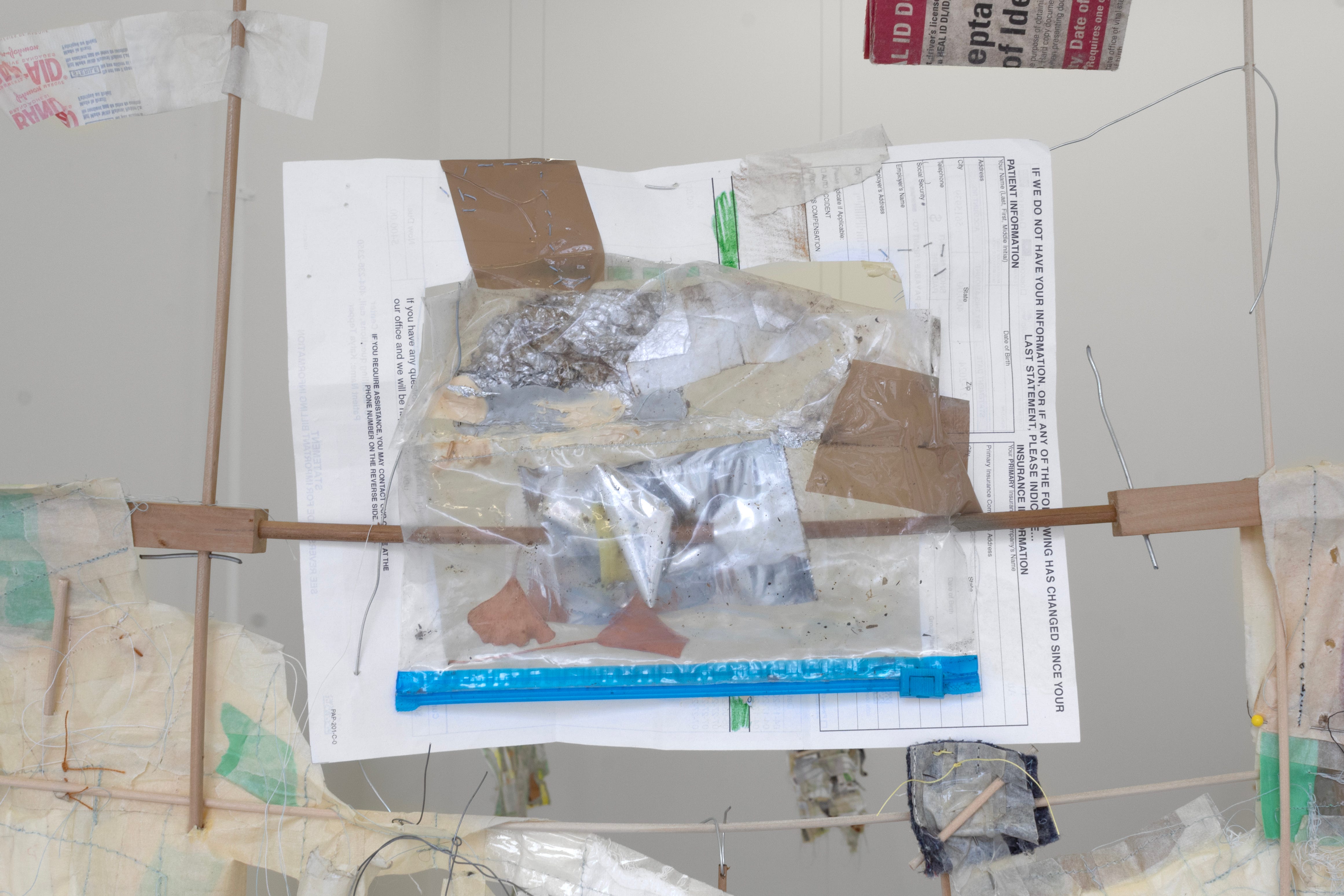 Of the three hanging methods —ceiling, wall, and floor— the floor-bound sculptures represent a huge turning point in my practice. Though I used to perform stand-up, I truly doubted my ability to make anything stand up. Seriously! Any sculptures that I managed to get off the wall were basically completely horizontal on the floor. This made sense to the extent that I side with lying down, and I worship the ground. But since many of the materials I gathered for this work were scavenged from the ground, re-orienting them directionally was important. I’m excited to have developed a construction language for making more dimensional floor-bound structures that still maintain some tension around their own standing. In Make-Shift Archive 1 (MyChart & Easy-Touch) and Make-Shift Archive 2 (Ricola wrappers), there’s a fragility, an implied precarity, to how these pieces hold themselves in space. As entirely modular through-dowel and pin-dowel designs, with no glue and no hardware, there’s an implicit suggestion that everything about them is temporarily configured. They have extra holes, and can be taken apart and re-arranged. And they are flimsy! Parts of them are slightly bowed or leaning. The objects that rest on them and are interwoven through them form a delicate balancing act. The way these objects distribute their weight in relation to each other is integral to the whole thing not collapsing, determining the compositions. They’re almost scales in that sense, with weights ranging from as light as a blade of grass, cigarette filter, cicada shell, and cough drop wrapper, to a bundle of sawdust, to the heavier end — rubber tubing, silicon caulking, a mailing envelope filled with paperwork from Takeda Pharmaceuticals.